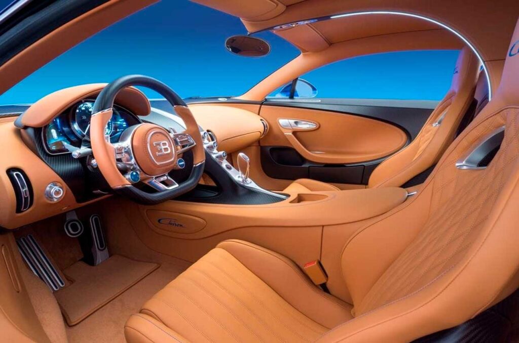 Entrar em um Chiron é uma experiência tão intensa quanto dirigi-lo. A Bugatti rejeita o minimalismo espartano de outros hypercars em favor de uma abordagem que remete aos couturiers franceses e aos melhores artesãos.